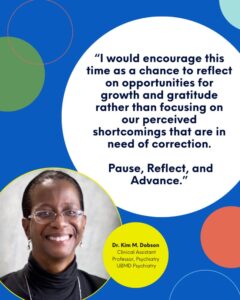 Dr. Kim Dobson says, “I would encourage this time as a chance to reflect on opportunities for growth and gratitude rather than focusing on our perceived shortcomings that are in need of correction. Pause, Reflect, and Advance.”